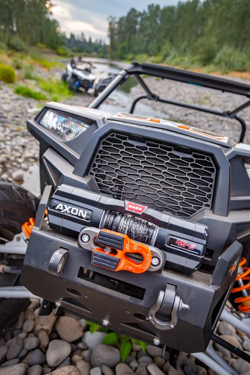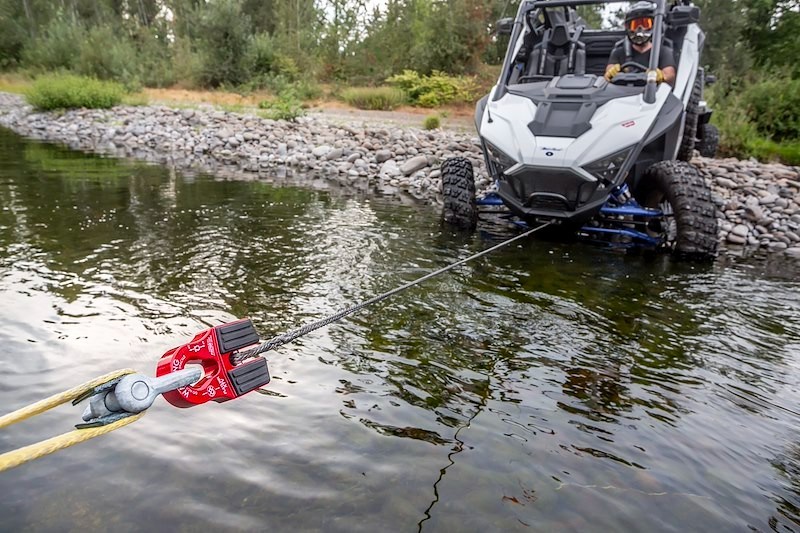 Factor 55 FlatLink XTV allows UTV and ATV winch owners to replace the conventional winch hook with a safer and stronger shackle and D-Ring. winch hooks can cut and fray recovery straps and often allow strap ends to escape during typical loose and tight cycles of a winching recovery. Screw pin shackles do not allow strap loops to escape due to the secure screw pin attachment. The FlatLink XTV does not require splicing and is compatible with steel cables or synthetic ropes up to 5/16 Inch. The cable eye is retained in the FlatLink XTV by a 7/16 Inch diameter titanium double shear pin and internal snap ring. It is easily installed in minutes. The EPDM Rubber Guards protects alloy fairleads and is securely attached to the FlatLink XTV with 4 barbed tips. The FlatLink XTV stows neatly against either roller or Hawse type fairleads and is designed to be used with common standard 1/2 to 5/8 Inch shackles. The FlatLink XTV is constructed of 6000 series billet aluminum and 6Al-4V titanium and is anodized and powder coated in 5 different colors. The FlatLink XTV has a max load rating of 8000 Pound and an ultimate failure of 28,000+ Pound.