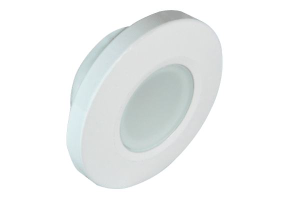 Boat Deck Light; Orbit; Flush Mount; 4 Watts; 10 To 30 Volt DC; Spectrum RGBW LED Bulb; 2 Inch Diameter x 3/4 Inch Depth Round; Clear Lens; White Housing; IP67 Waterproof; -31 Degree Fahrenheit To +131 Degree Fahrenheit Operating Temperature; 290 Milliampere At 12 Volt DC/ 160 Milliampere At 24 Volt DC; CE Certified; With Third Party Dimmer Compatibility