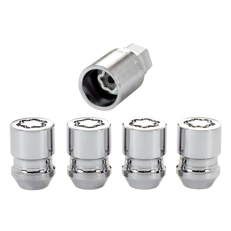Wheel Lock; Lug Nut Lock; 12 Millimeter X 1.5 Thread Size; Conical Seat; Acorn Lug Use With Steel/ Aluminum Wheels; 1.28 Inch Overall Length; Dual Hex Key Wrench Size 19 Millimeter And 21 Millimeter; Chrome Plated; Steel; Set Of 4 With Key