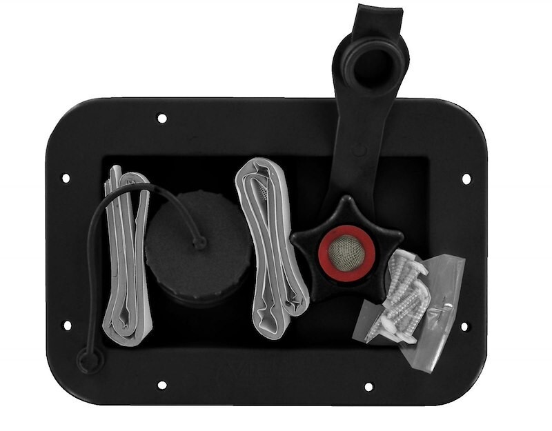 Fresh Water Inlet; Used For RV Fresh Water System; Gravity Hatch Type; 1/2 Inch Male Pipe Thread/ 1-1/4 Inch Barb Connection/ 1/2 Inch Air Vent; For 5-1/2 Inch Width x 3-1/2 Inch Height Cutout; 7-1/2 Inch Width x 5-1/4 Inch Height Overall Dimensions; Without Check Valve; Black; With Installation Tape and Hardware; With Retail Package