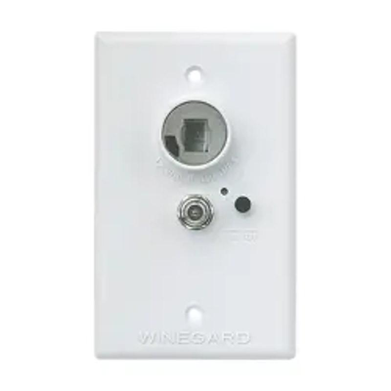 White wall plate/power supply to operate your Winegard RV antenna with outdoor receptacle. Wall plate/power supply provides +12VDC to antenna and +12 Volt receptacle, as well as antenna signals to two TV sets. Cable input from outdoor receptacle connects to wall plate and may be switched so either antenna or cable signals may be watched.